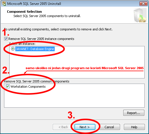 - Na zaslonu će se pojaviti dijaloški okvir Microsoft SQL Server 2005 Uninstall. U ovom dijaloškom okviru označite JAVANET: Database engine (korak 1. na sljedećoj slici), ukoliko ste sigurni da ni jedan drugi program ne koristi Microsoft SQL Server možete i njega ukloniti ukoliko označite Workstation components (korak 2.). Kliknite Next.