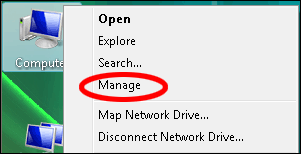 - Kliknite desnom tipkom na ikonu Computer (My Computer u Windowsima XP) na radnoj površini (desktopu) i iz padajućeg izbornika izaberite naredbu Manage kao na sljedećoj slici.