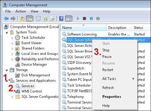 - U Computer Management prozoru u lijevom okviru kliknite na Services and Applications, zatim na Services, te u desnom okviru kliknite desnom tipkom miša na SQL Server (JAVANET) i iz padajućeg izbornika izaberite naredbu Stop kao na sljedećoj slici.